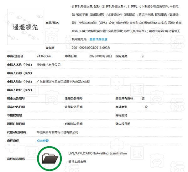 2023年9月28日,華為技術(shù)有限公司向國家局提交了一件商標(biāo)的申請請求,商標(biāo)字樣就是“遙遙領(lǐng)先”。